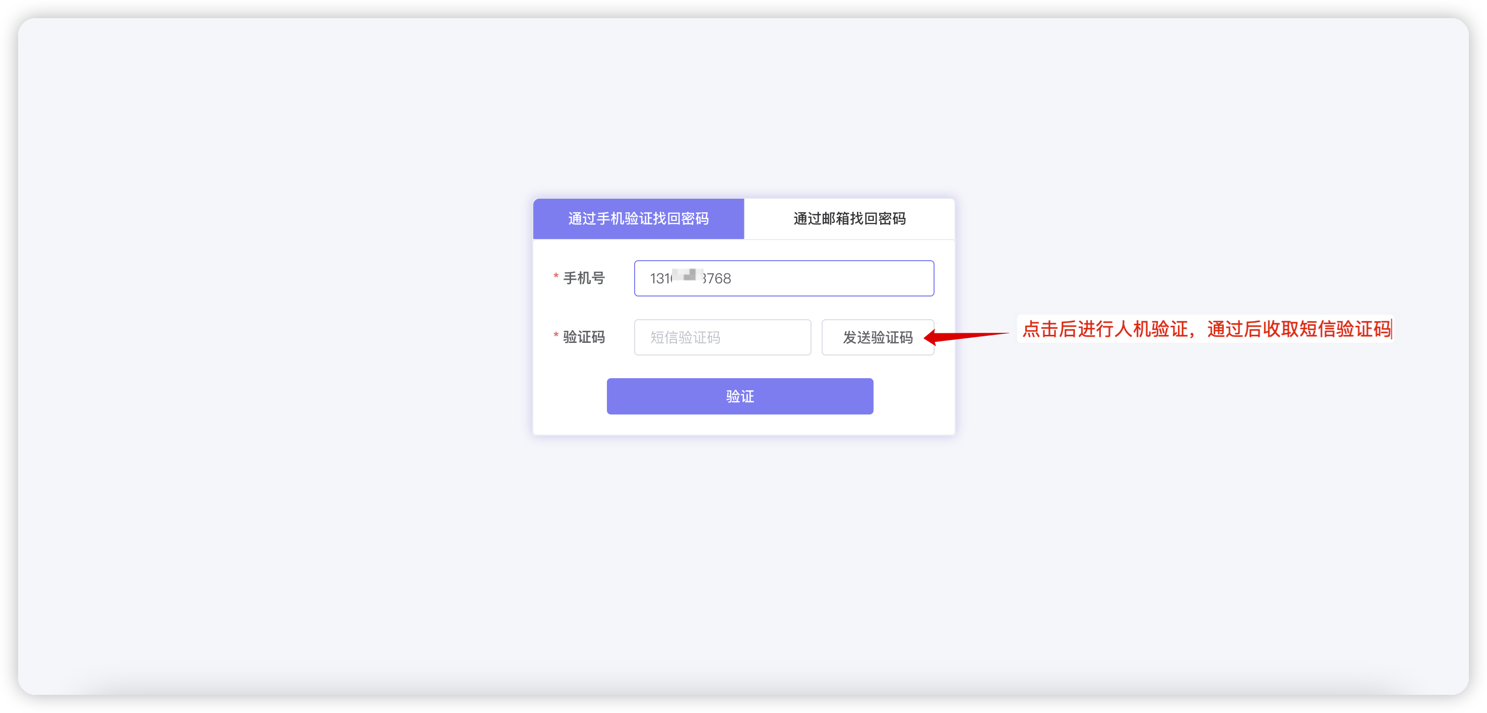 输入手机号码进行人机验证码,通过后收取短信验证码进行验证