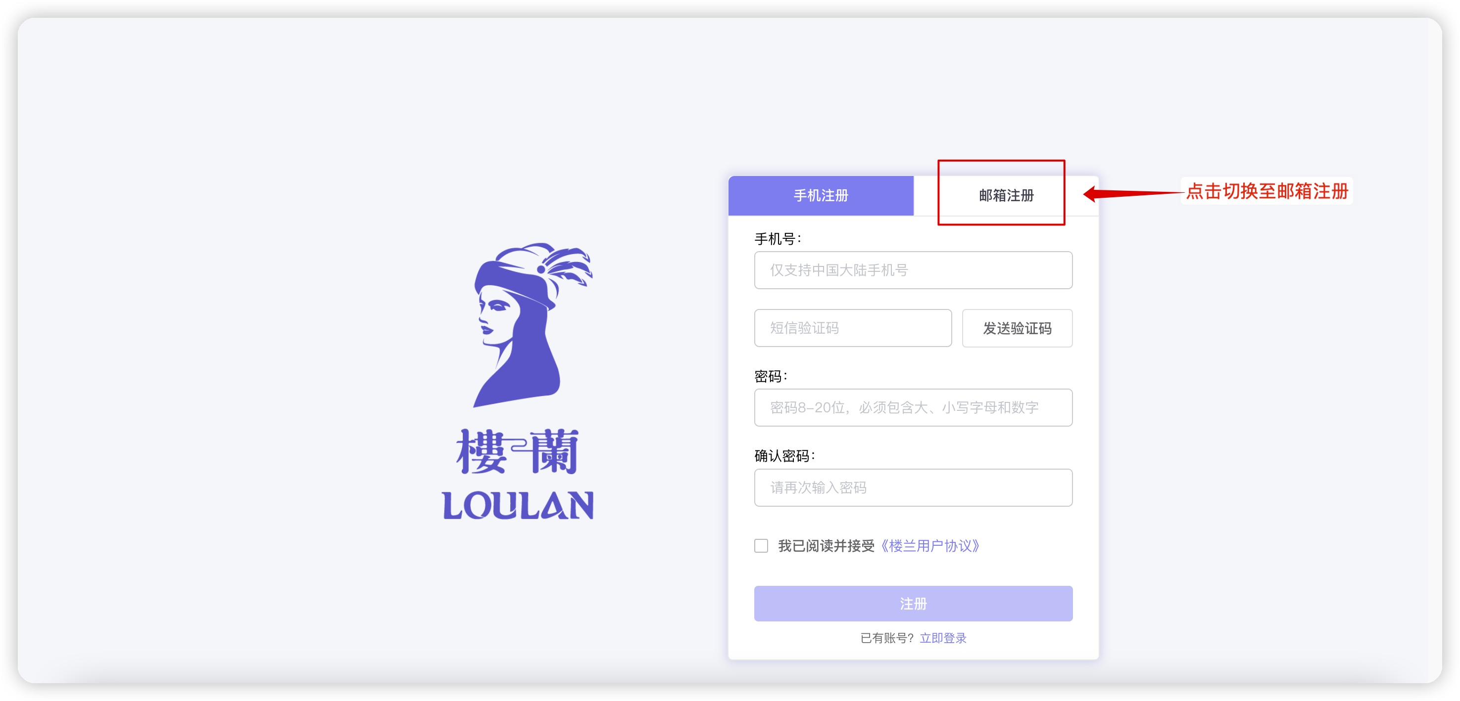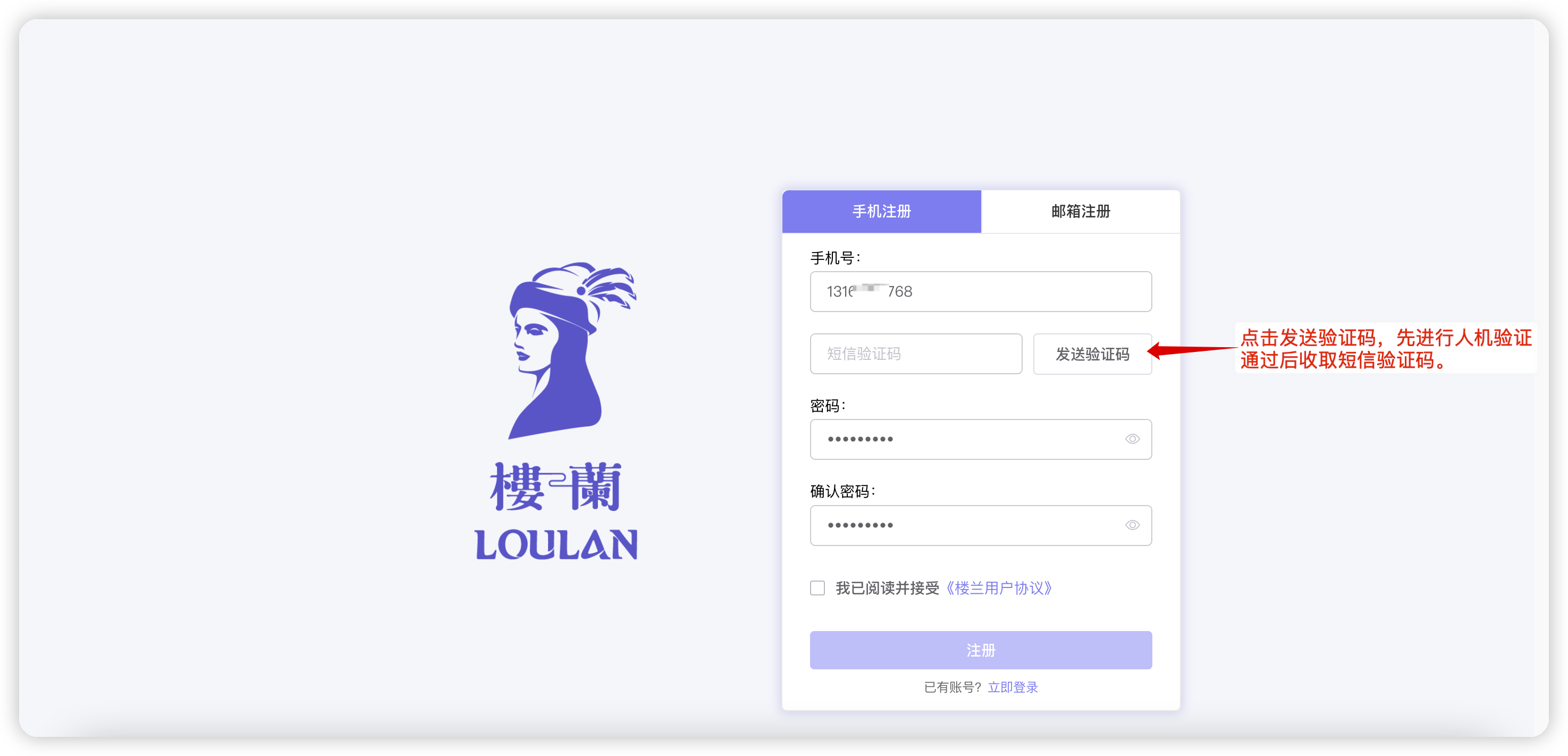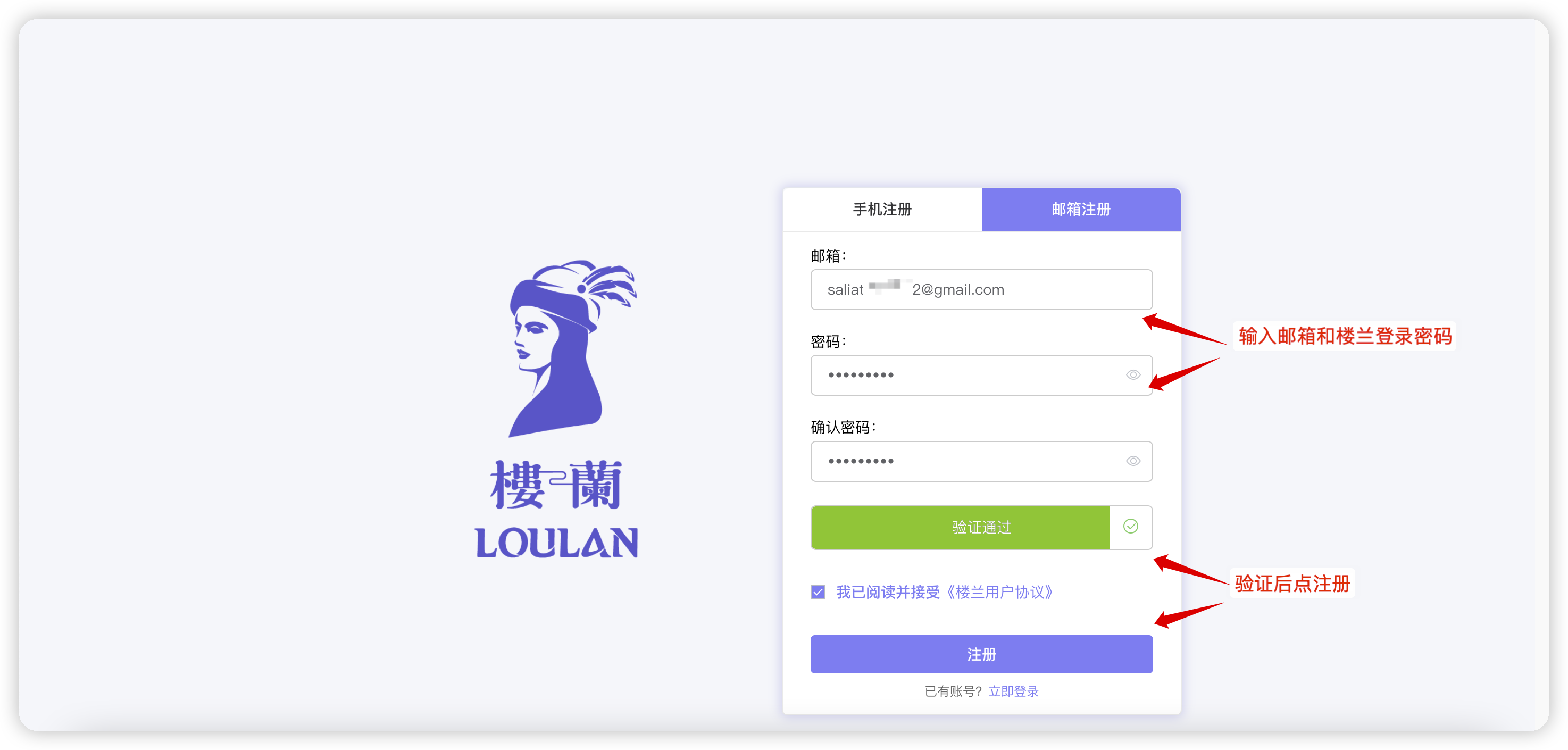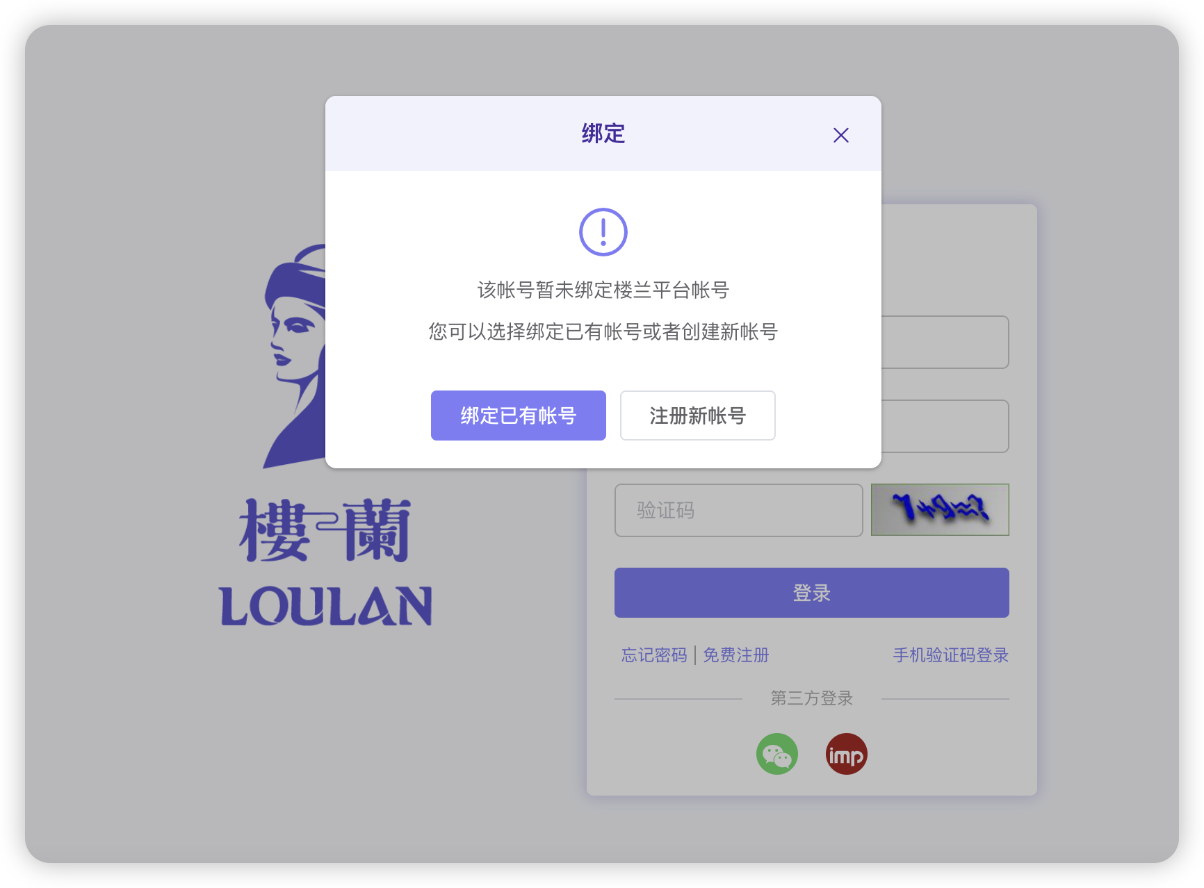 需要绑定已有楼兰账号或新注册楼兰账号绑定登录